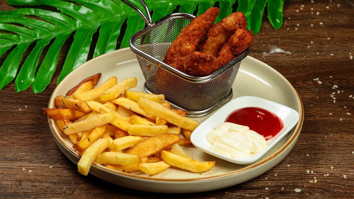 Suxaridə hazırlanmış toyuq filesi, kartof fri, ketçup, mayonez