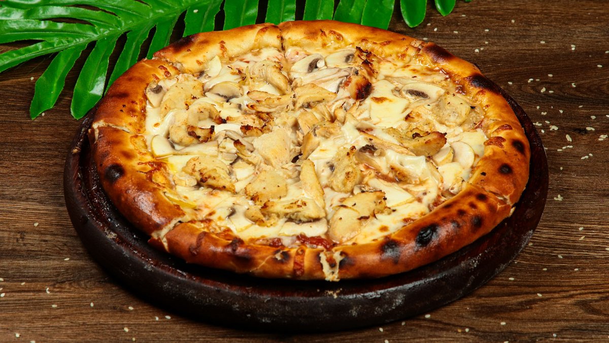 Özəl xəmir, özəl sous, toyuq file, göbələk, qarğıdalı, mozzarella pendir