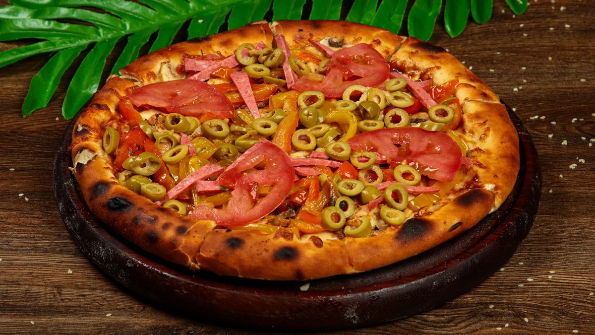 Özəl xəmir, özəl sous, sucuk, pomidor, zeytun, qarğıdalı, mozzarella pendiri