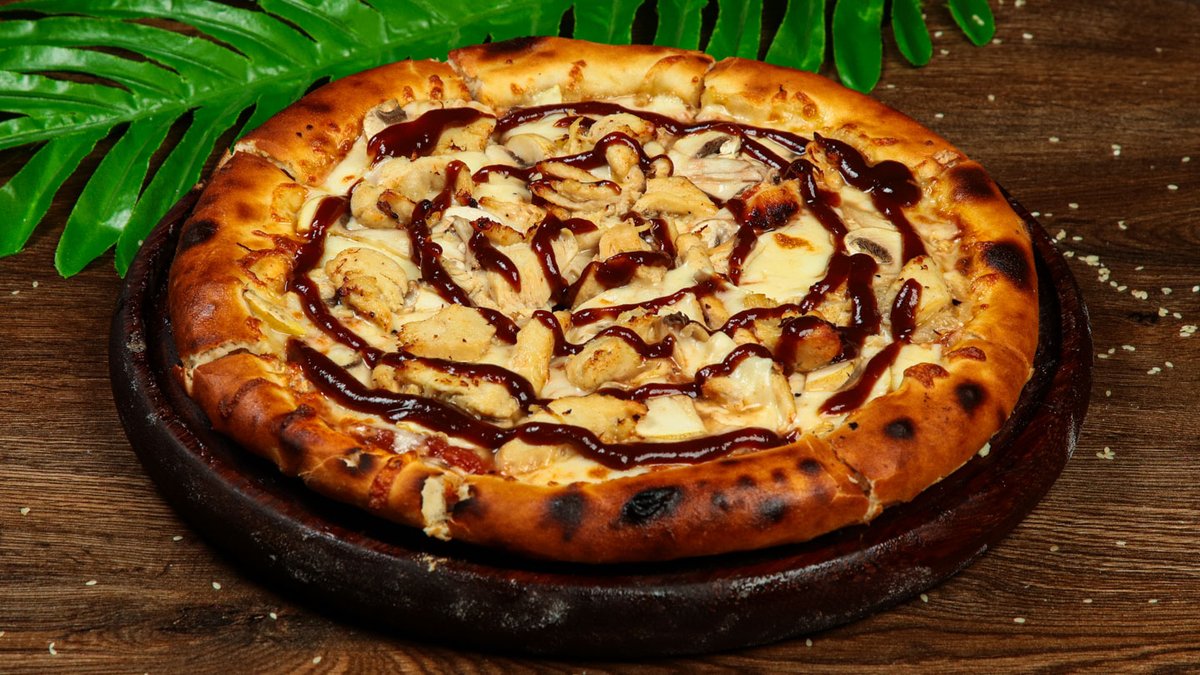 Özəl xəmir, özəl sous, toyuq filesi, pomidor, zeytun, mozzarella pendir