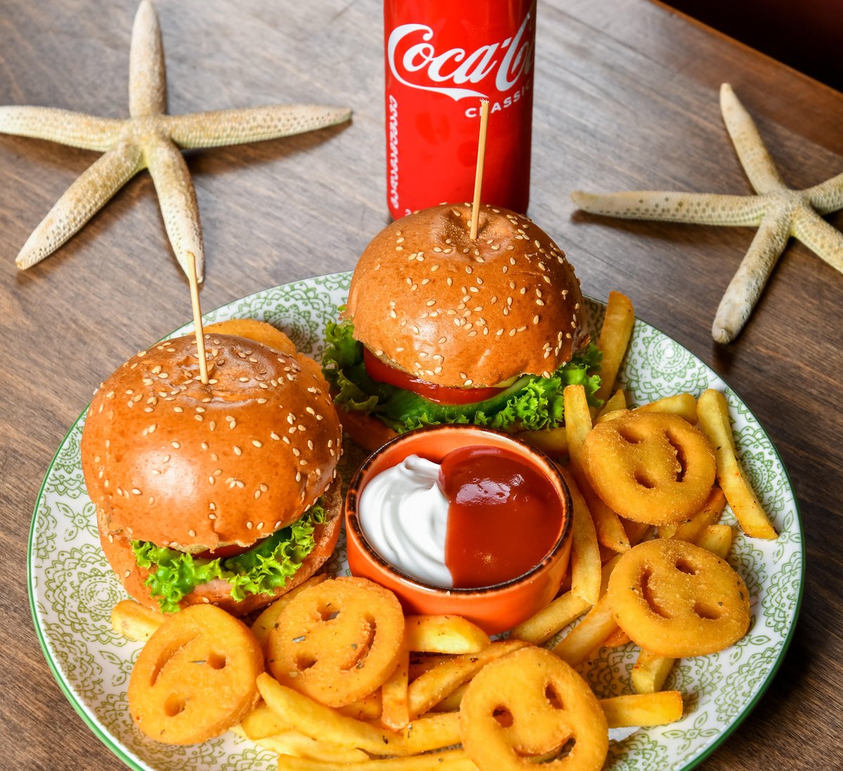 qovrulmuş can əti, pomidor, xiyar, yumurta, gauda pendiri, kartof fri