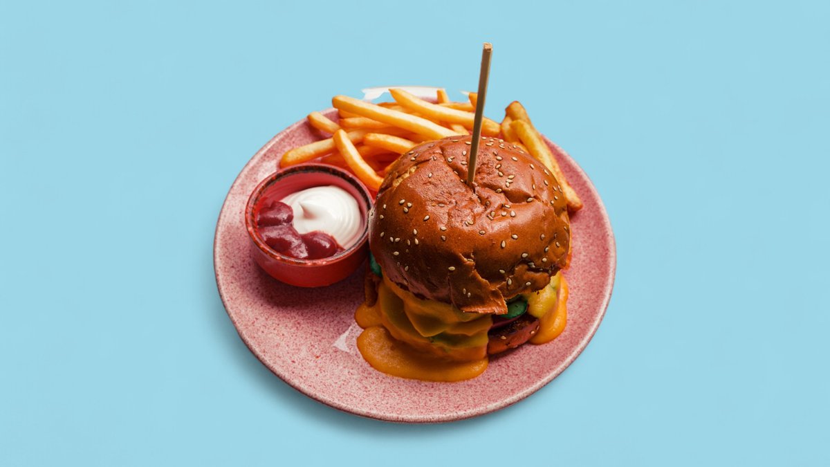 Toyuq filesi, holland pendiri, pomidor, xiyar, kahı, kartof qızartması, klab sousu