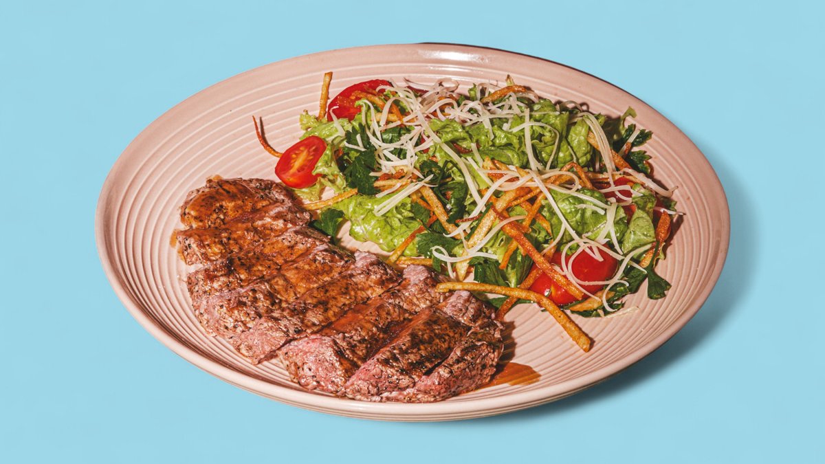 qovrulmuş can əti, qırmızı bibər, qurudulmuş pomidor, çeri pomidor, kabak, parmezan pendiri, yaşıllıq, teriyaki sous