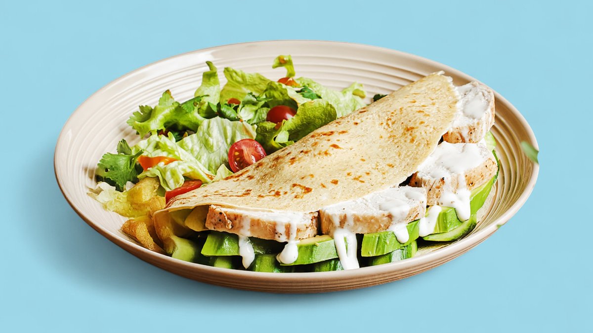 toyuq, avokado, çeri pomidor, parmezan pendiri, yaşıllıq, xüsusi sous