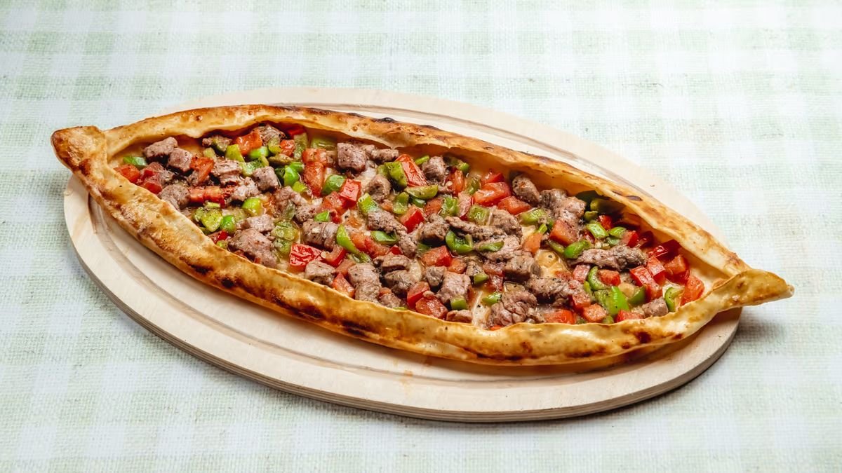 Sous, mazzarella, marina olunmuş mal əti, BBQ sosusu, pomidor, qırmızı soğan, çili bibər