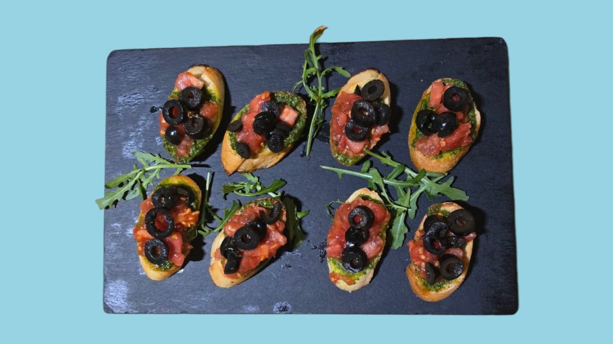 брускети с домататено конкасе, маслини и босилково песто