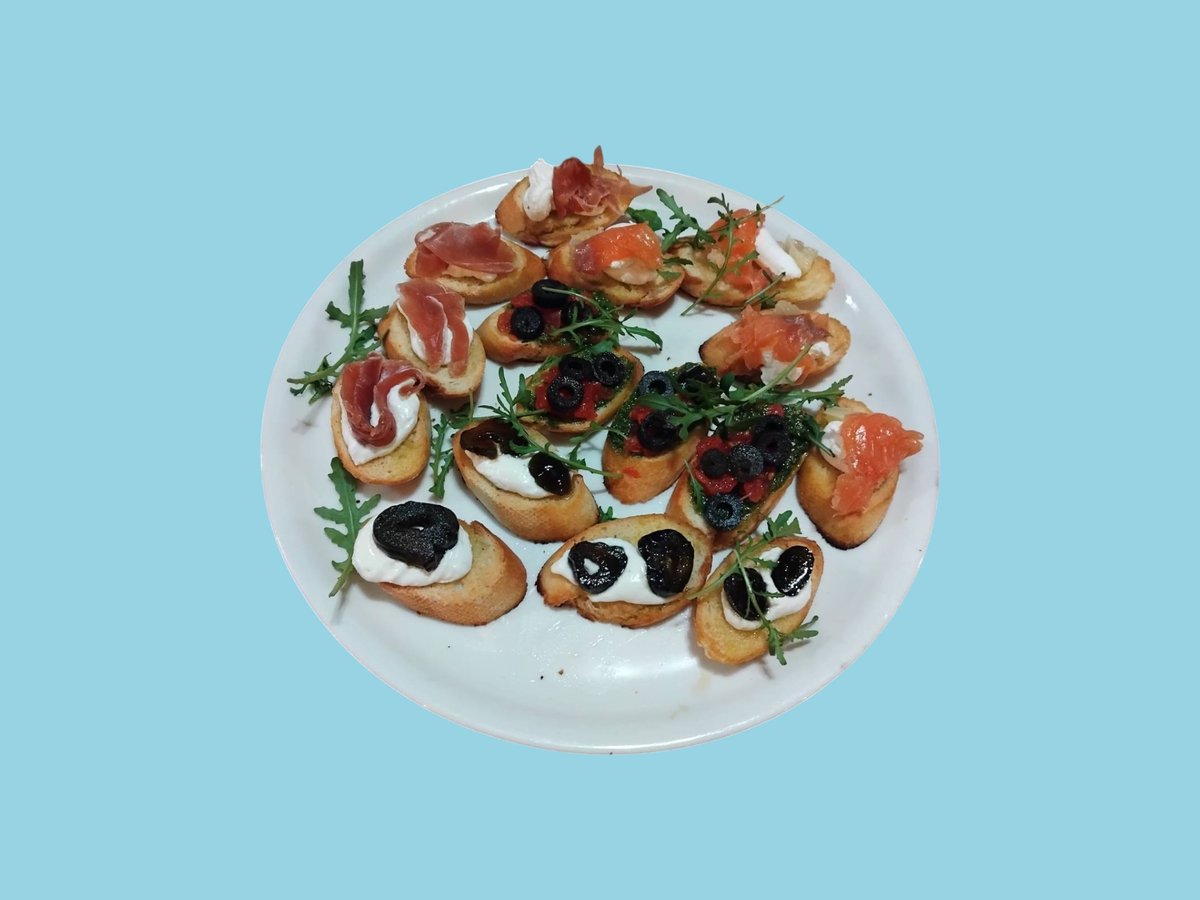 брускети смокини 4 бр, брускети с домати и песто 4 бр, брускети със сьомга 4 бр, брускети с прошуто 4 бр