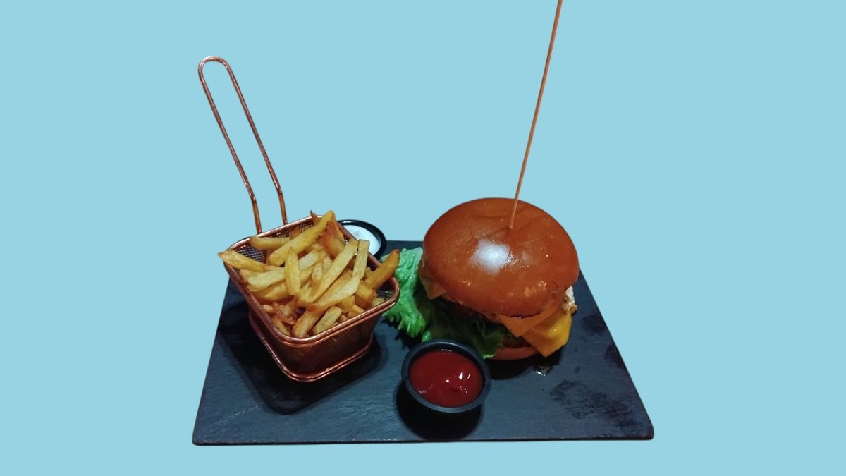 телешка кайма, бекон, картофки, кисели краставички, чедър, домат, марула, яйце, лук