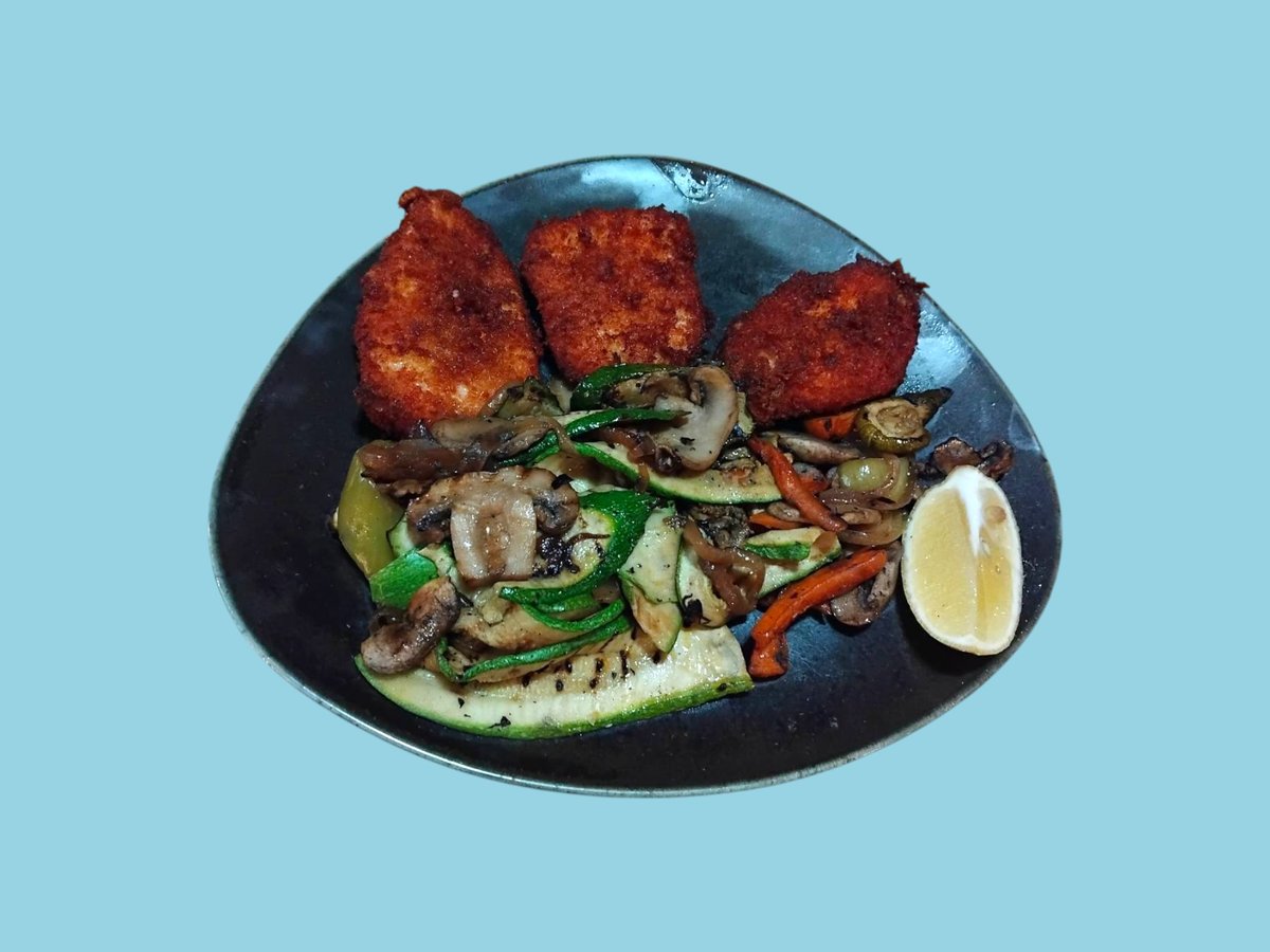 Пилешки филенца с пармезанова коричка с гриловани зеленчуци