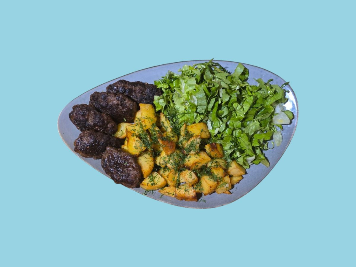 Телешки кюфтенца на скара със сотирани картофи и микс зелена салата