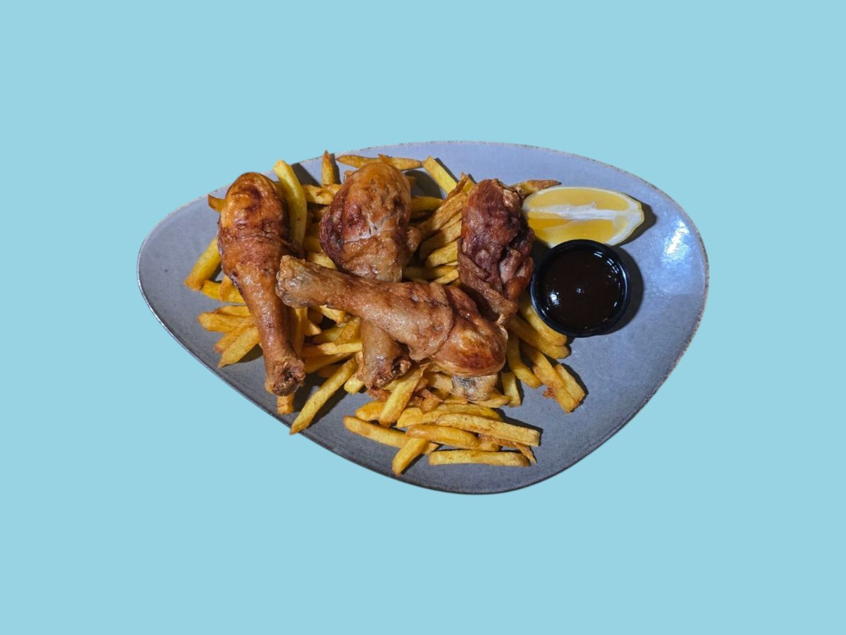 пилешки пържени парти бутчета 5 бр 1 порция, пилешки крилца 1 порция, пържени картофки 1 порция, палачинка със шоколад 2 бр подарък 1 литър кока кола