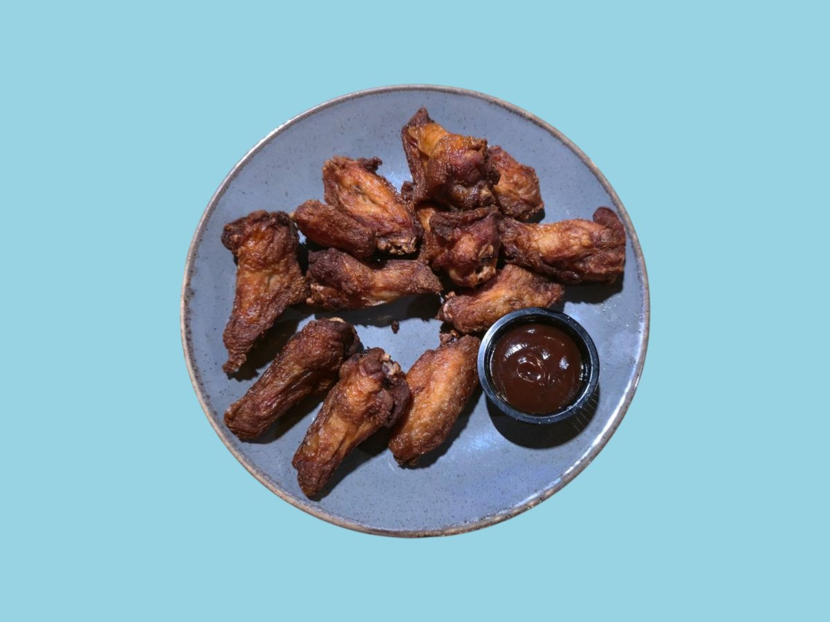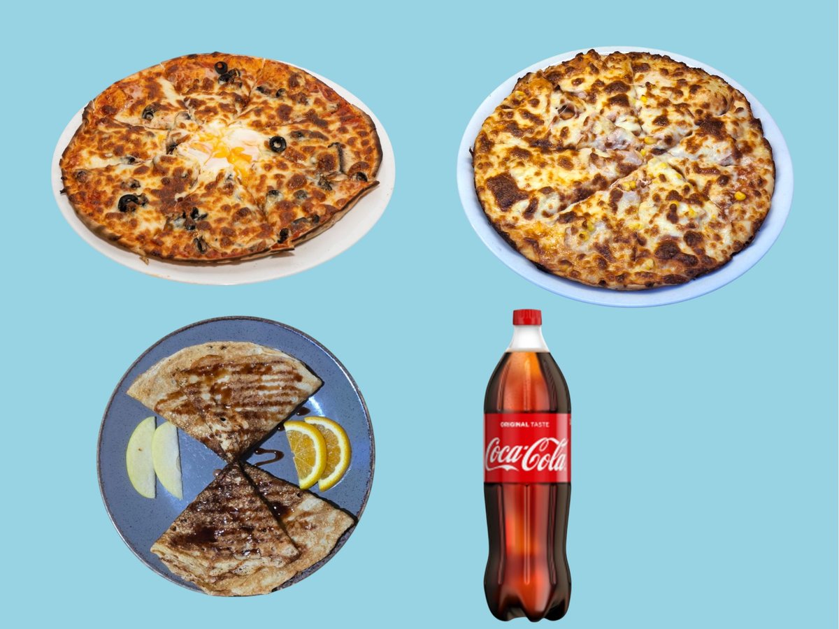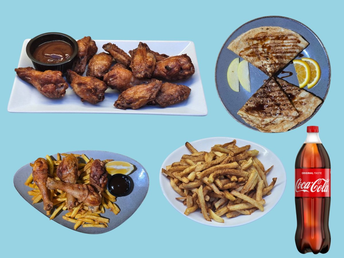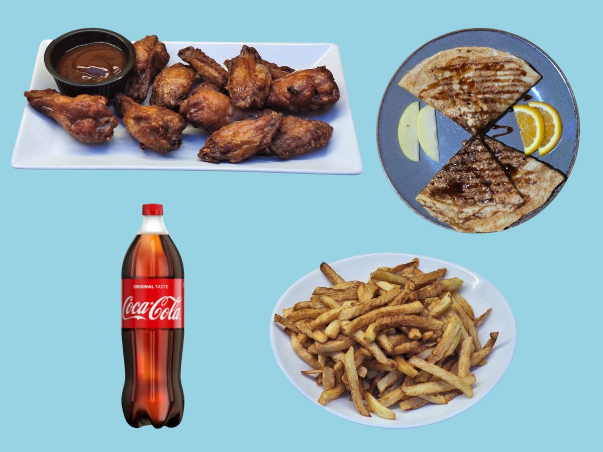 пилешки крилца с bbq сос 2 бр, пържени картофки 2 бр, палачинка със шоколад 2 бр и подарък 1 л кока кола