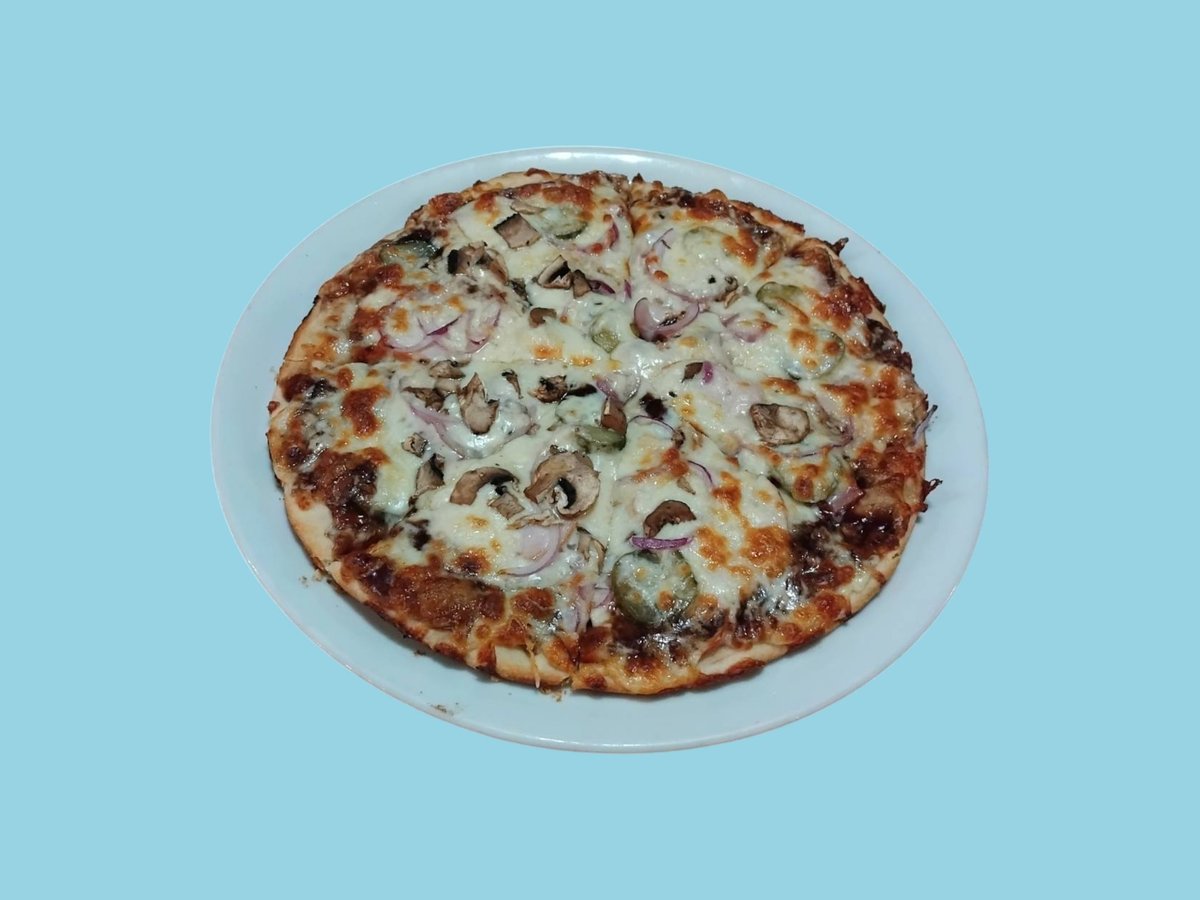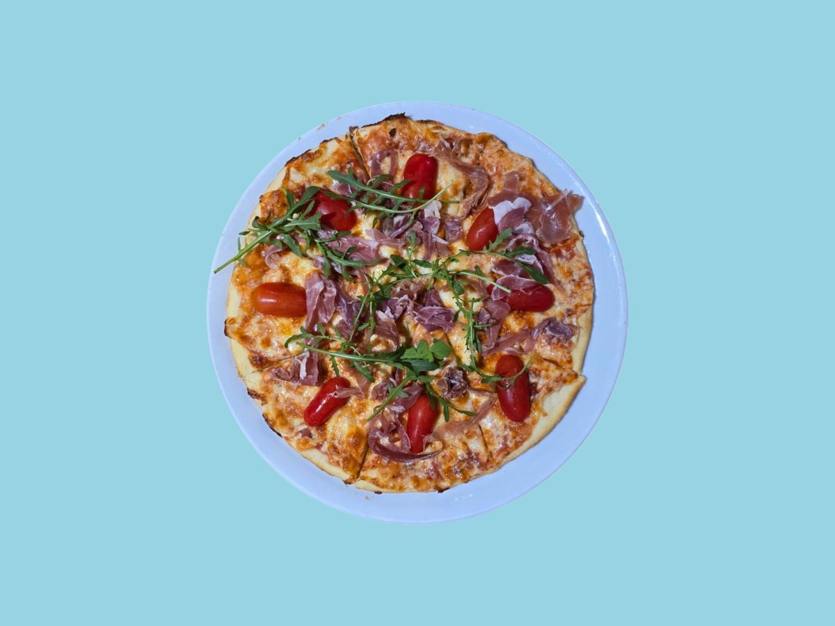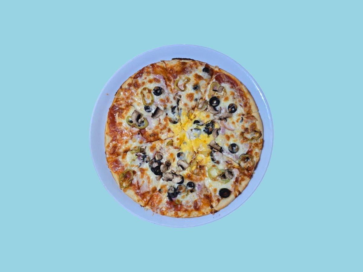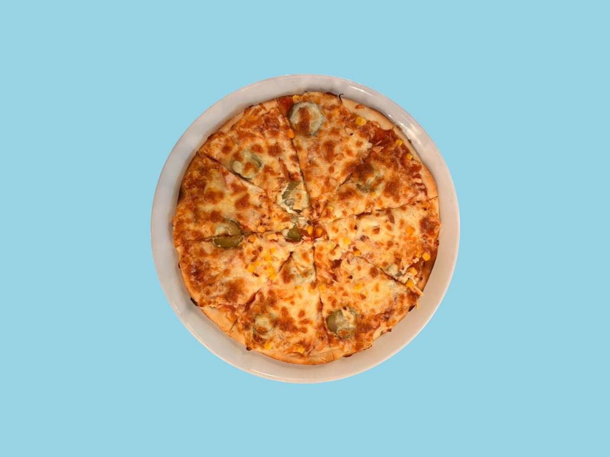 шунка, кисели краставички, маслини, царевица, кашкавал, доматен сос 32см