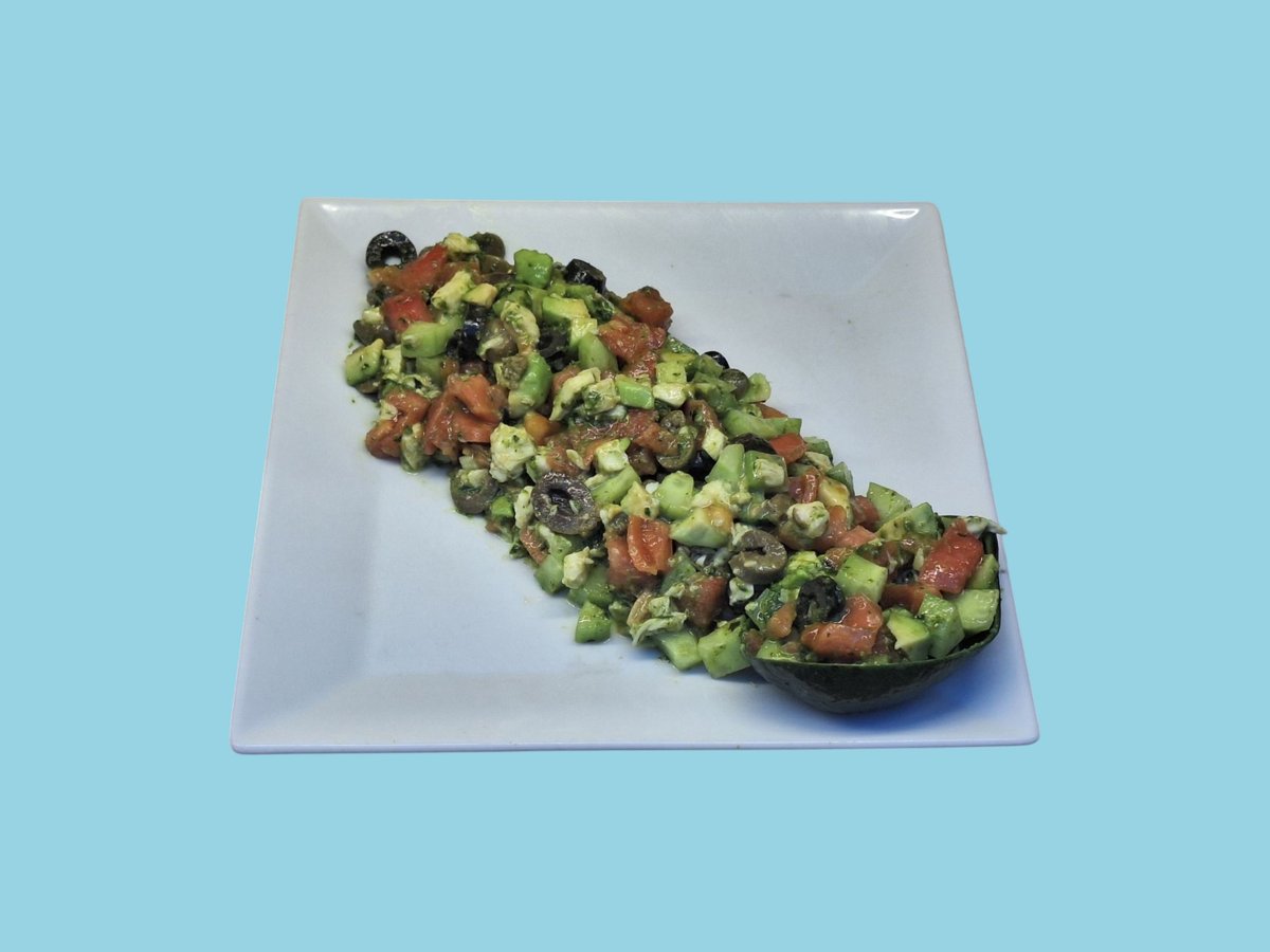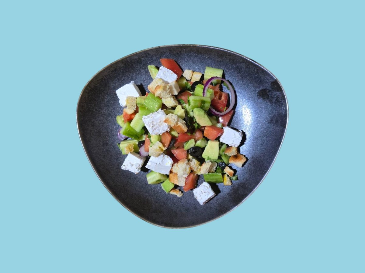 авокадо, домати, краставици, сирене, маслини, червен лук, крутони, магданоз, босилек 0,350 г