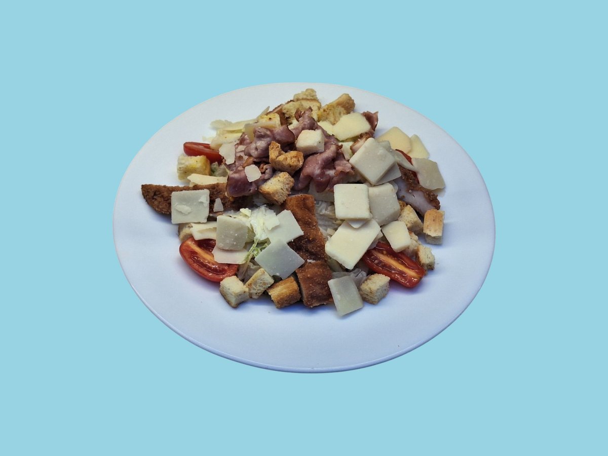 айсберг, хрупкаво пилешко филе, бекон, чери домати, пармезан, крутони, сос цезар 0,350 г
