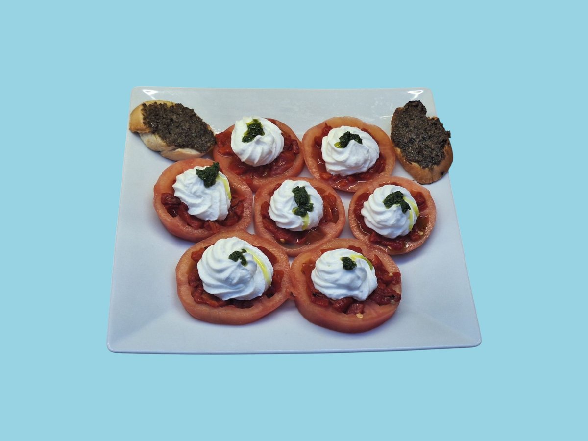 белени домати с мус от сирена, печена чушка, брускети с маслинова паста 0,350 г