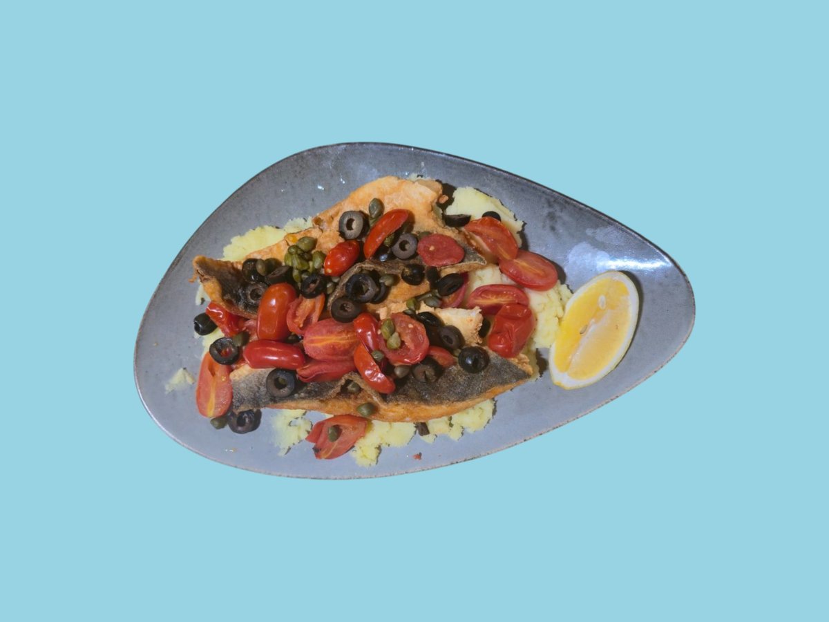 Филе от Лаврак, сотирани чери домати, каперси, маслини, картофено пюре, босилек 0,350 г