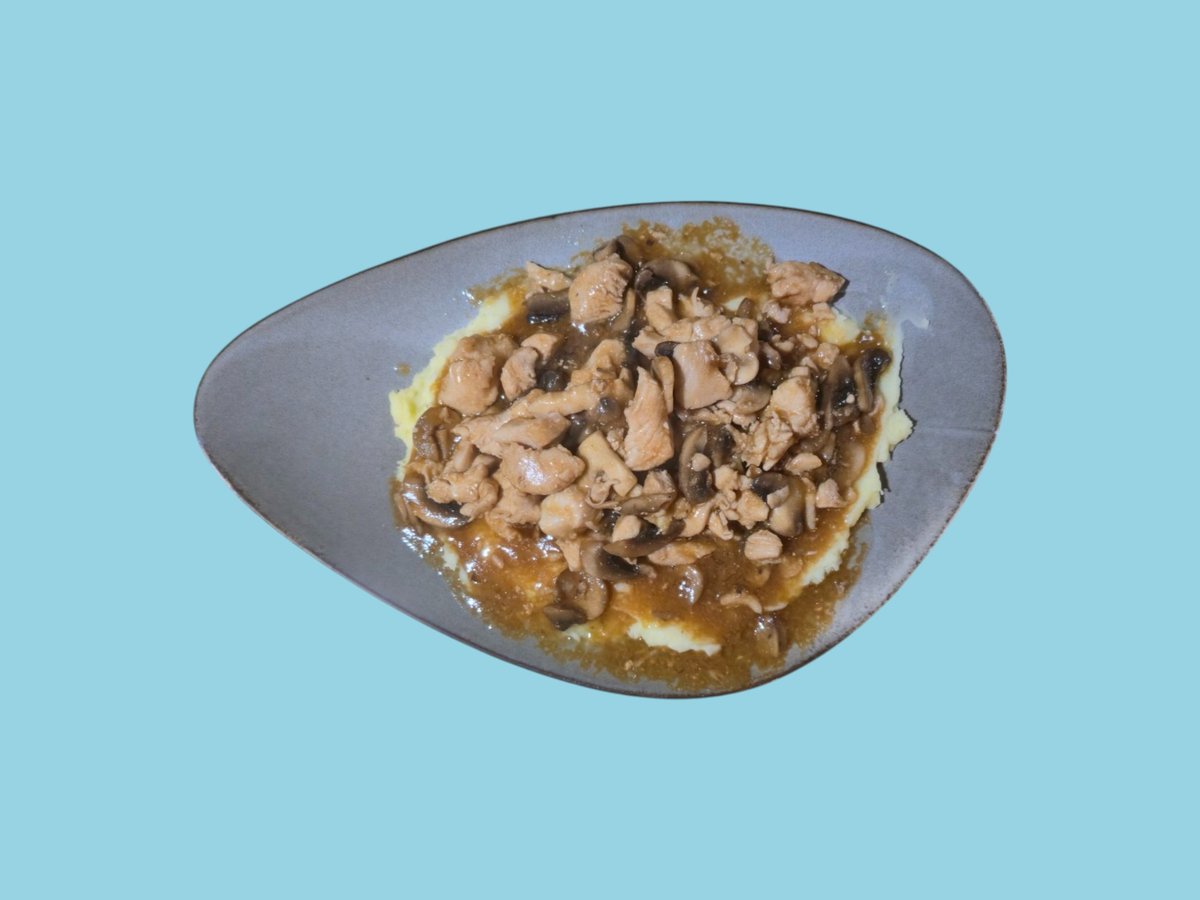Пилешко филе, гъби, кашкавал, картофено пюре, соев сос 0,350 г