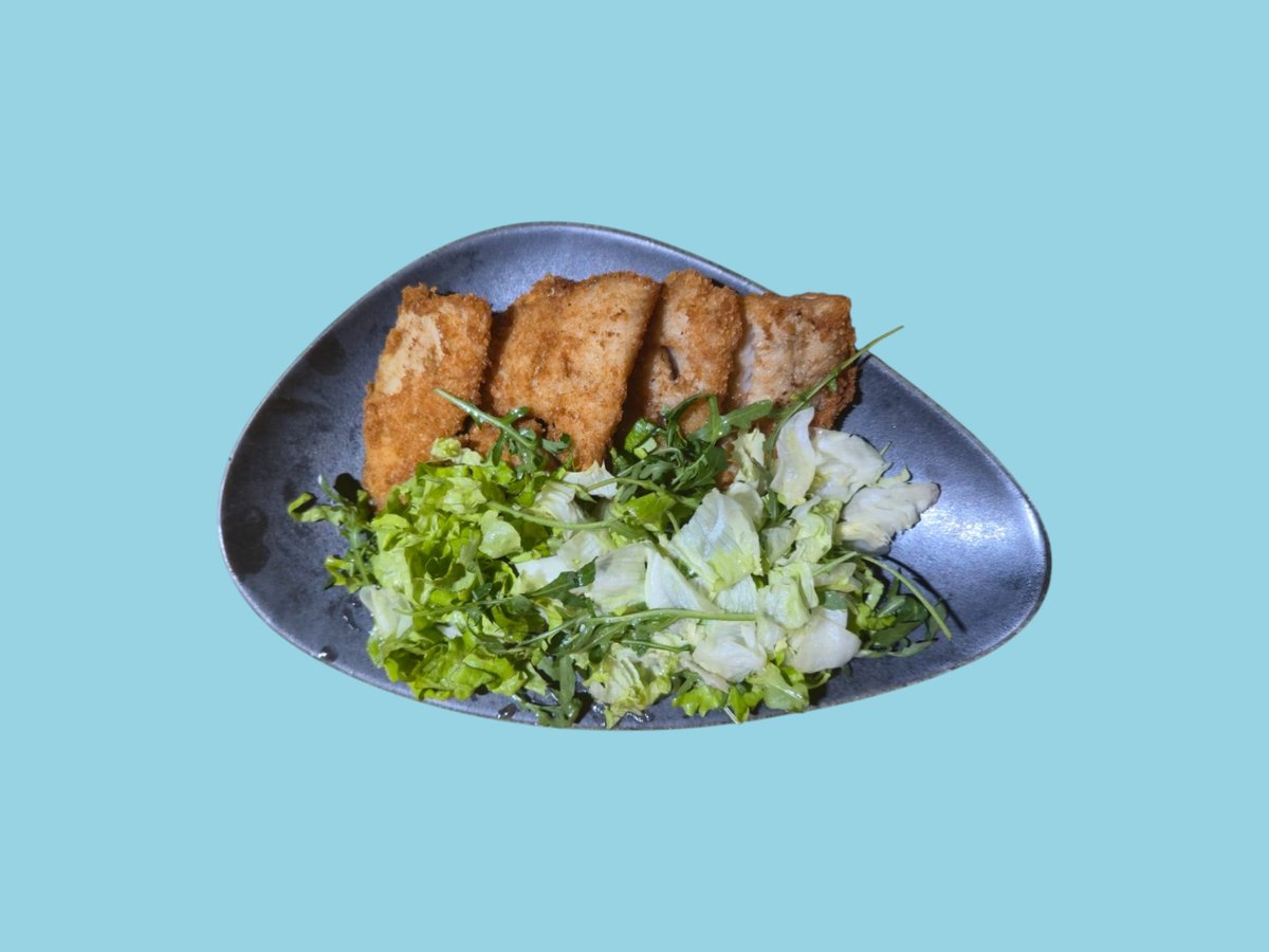 Бяла риба с пармезанова коричка и микс зелени салатки