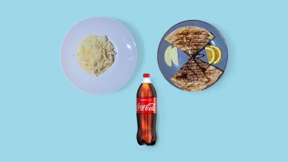 ризото пиле и сметана 1 бр, ньоки доматена салса 1 бр, палачинка със шоколад 2 бр и подарък 1 л кока кола