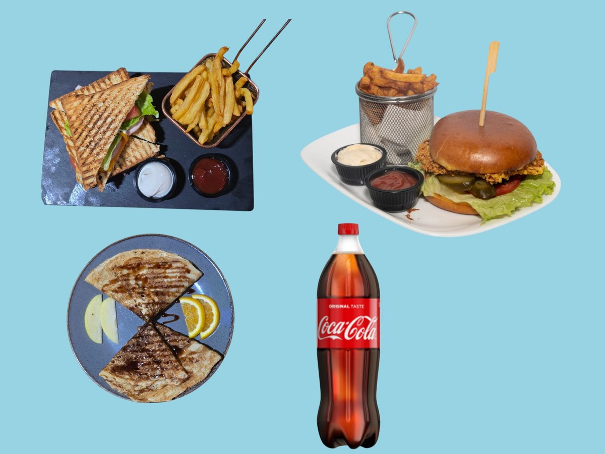 клуб сандвич пилешки 1 бр, бургер пилешки 1 бр, палачинка със шоколад 2 бр и подарък 1 л кока кола