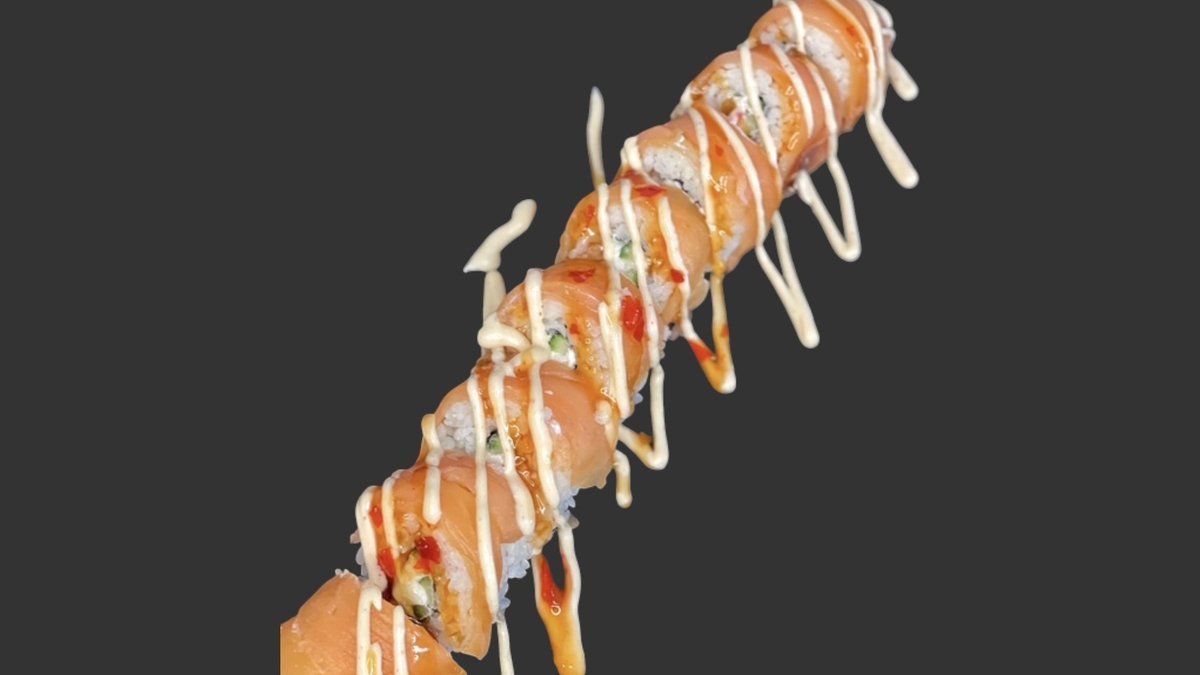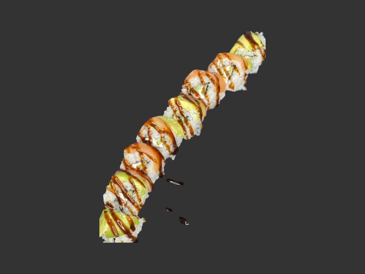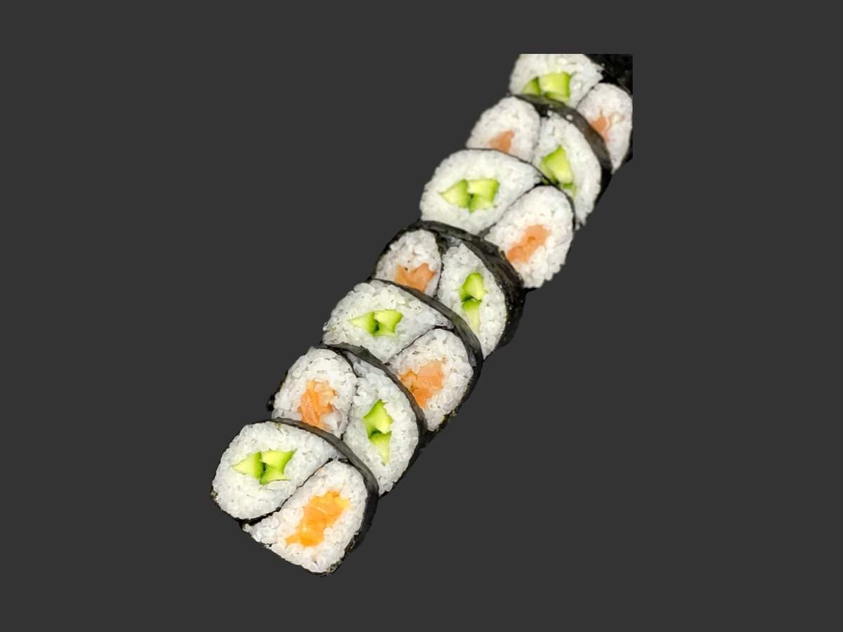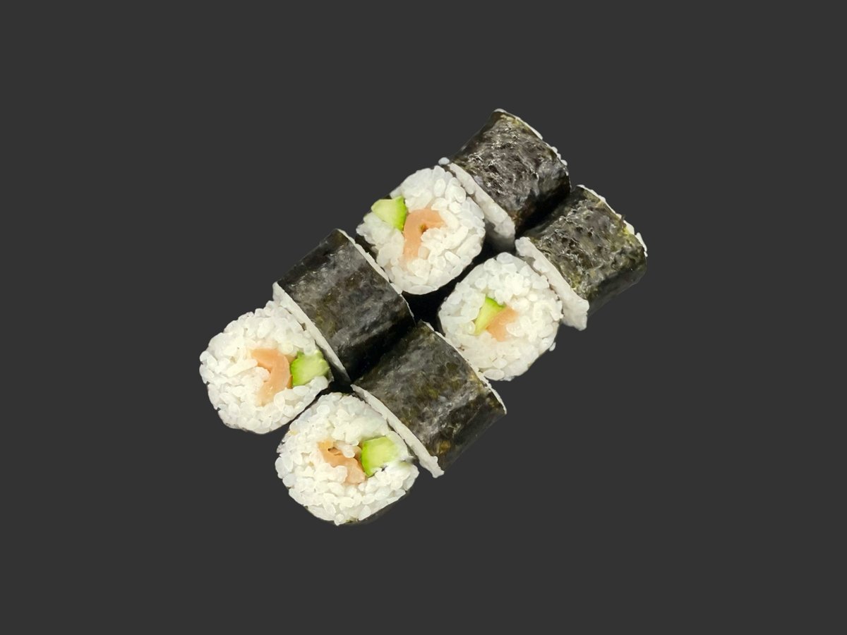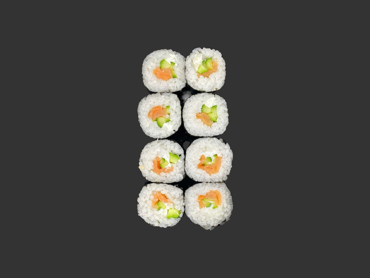Нори, ориз, мус от сурими, пушена сьомга, краставица, пикантна японска майонеза, сладко чили 8броя