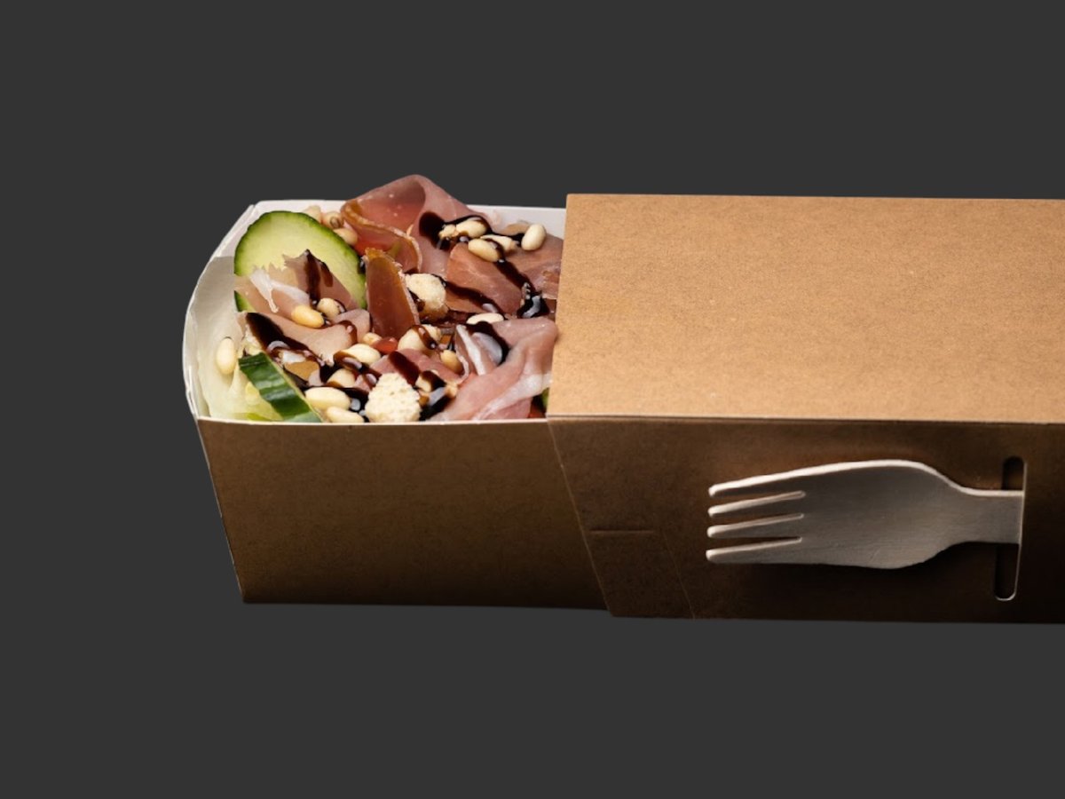 Айсбер, домат, краставица, прошуто, крутони, кедрови ядки, пармезан, зехтин и балсамико с маслини-350г