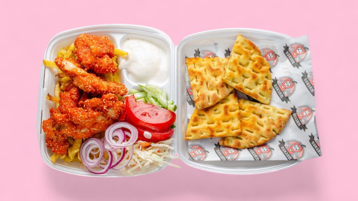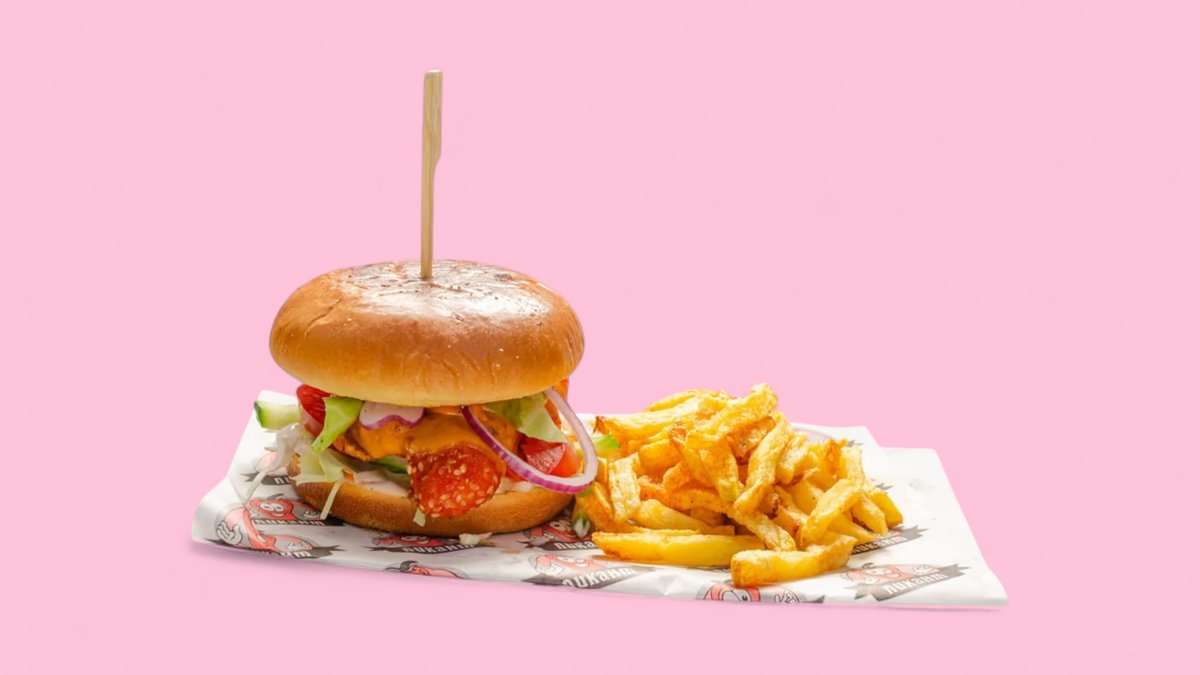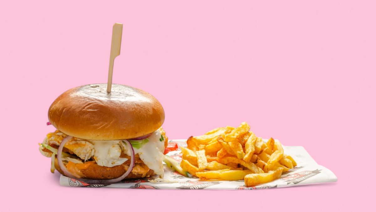 хлебче Пикант, бургер сос, пилешко месо от дюнера, айсберг, краставици, домат, лук (по избор) картофи, чеснов сос Пикант