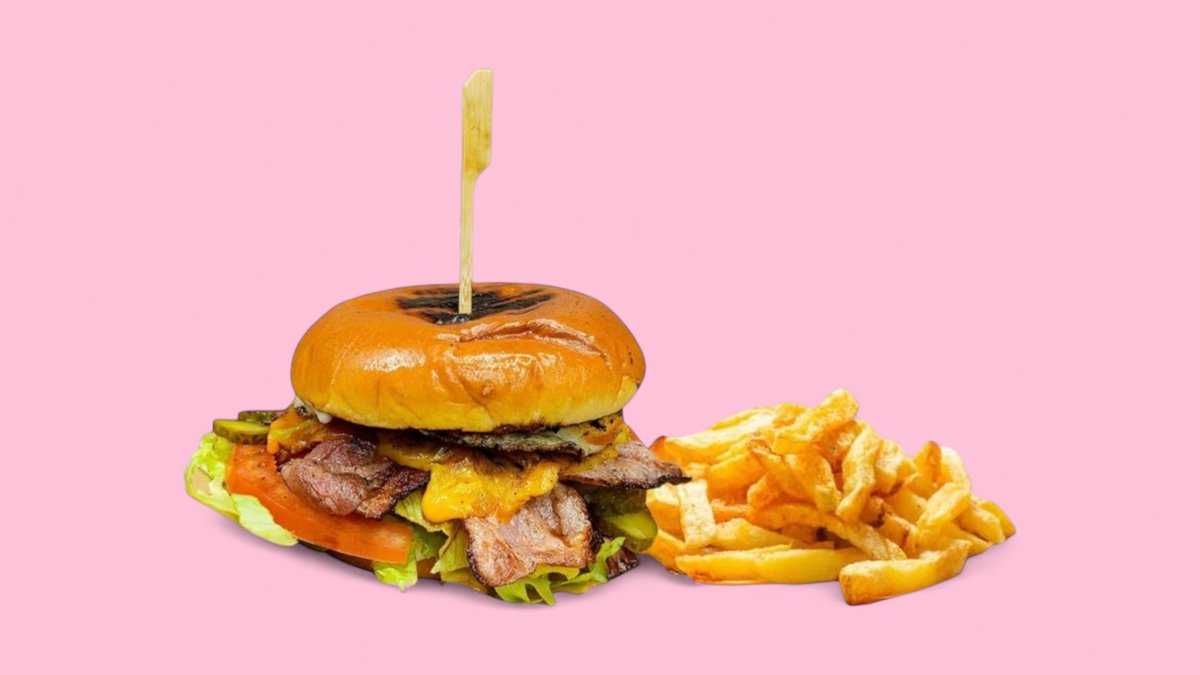 броиш питка, бекон ,яйце, бургер сос , Чедър слайс , зеленчуци , картофи