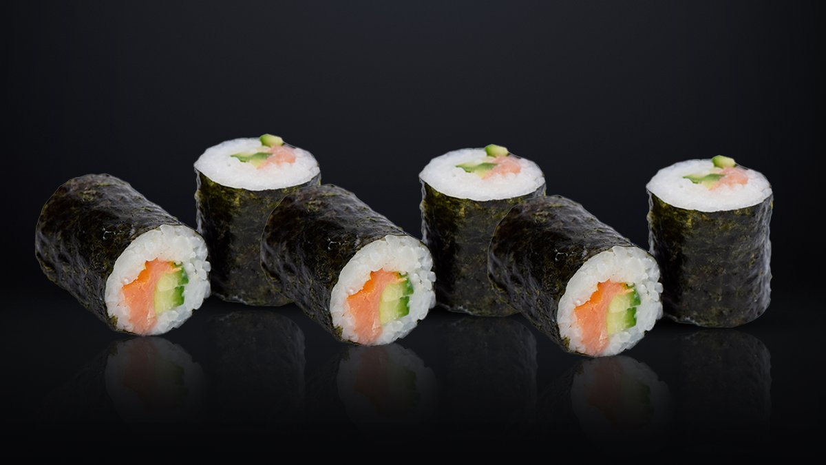 Ориз, нори, пушена сьомга, краставица. 6 броя -120 гр.