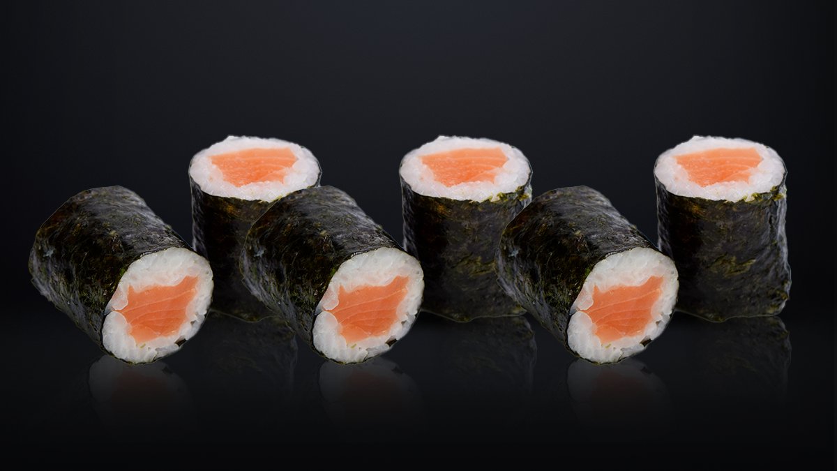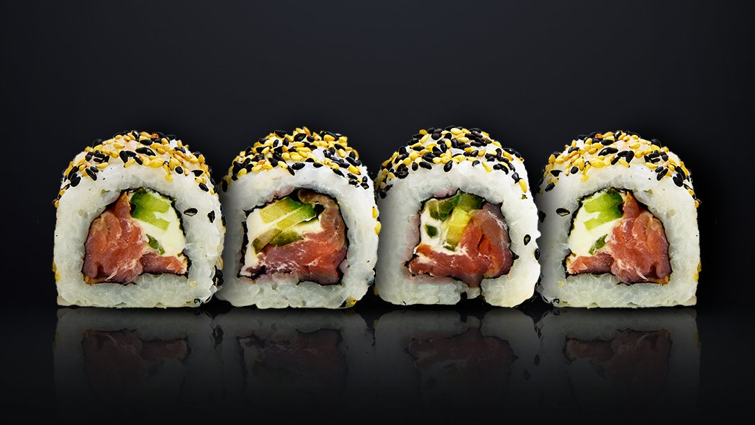ориз, пушена сьомга, филаделфия, нори, краставица, бял и черен сусам. 4 броя -110 гр. 8 броя -220 гр.