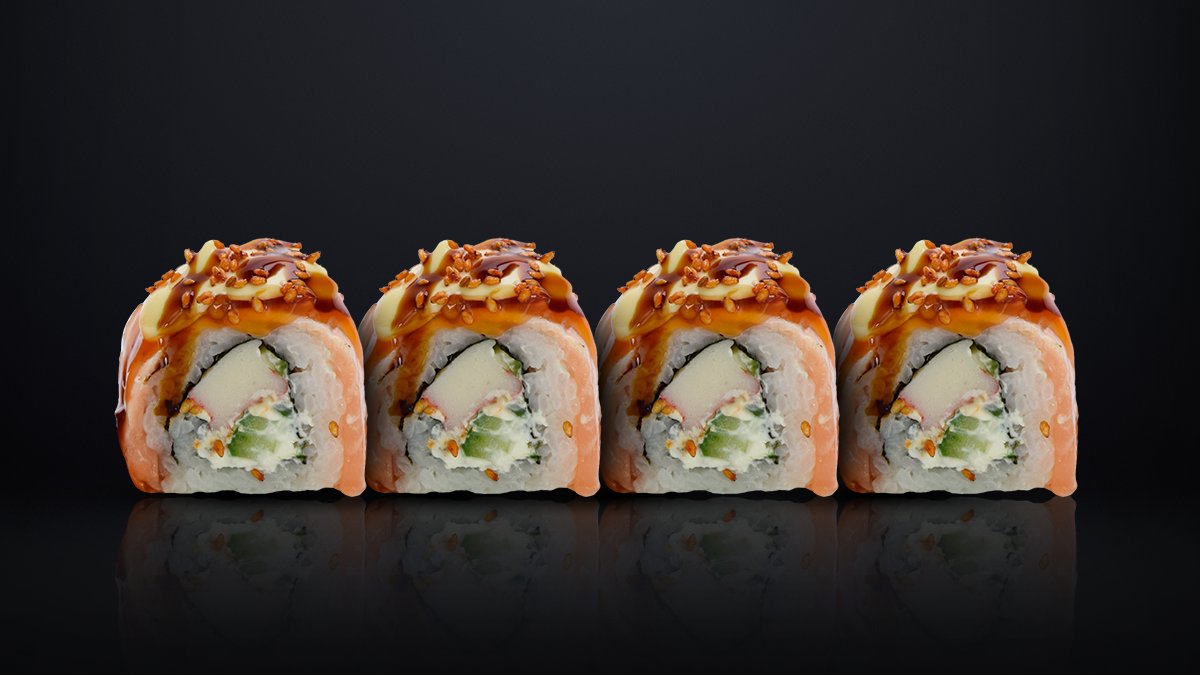 ориз, нори, ролца от рак, запечена сьомга, филаделфия, краставица, ким-чи сусам, дракон сос, мастър майонеза, унаги сос. 4 броя -120 гр. 8 броя -240 гр.