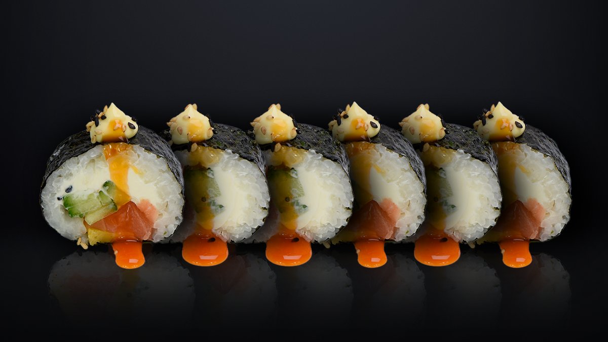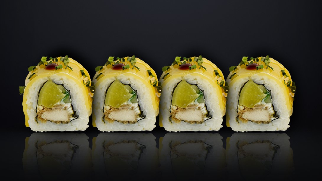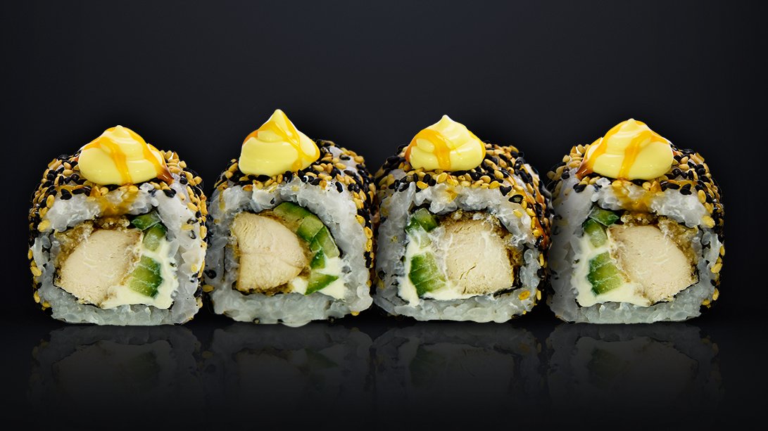 ориз, нори, хрупкаво пиле, филаделфия , краставица, сусам, чедър, мастър майонеза, манго сос. 6 броя -180 гр.