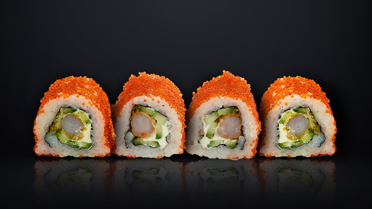 ориз, скарида в темпура, филаделфия, нори краставица, хайвер тобико. 4 бр. - 110 гр. 8 бр. - 220 гр.