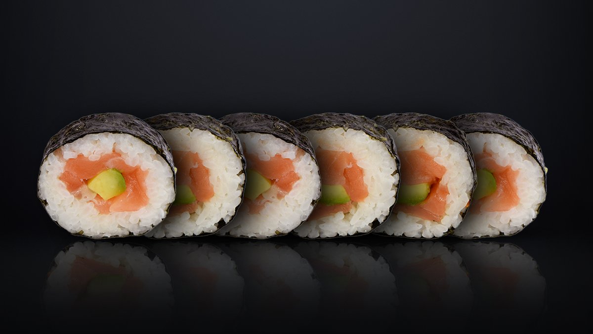 ориз, нори, сьомга, авокадо, ким-чи сусам 6 броя -160 гр.