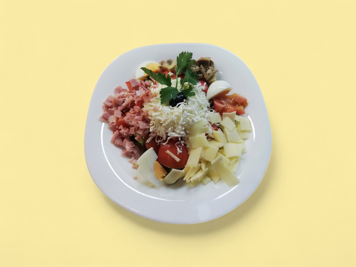 домат, краставици, чушка, сирене, шунка, кашкавал, яйце 400г