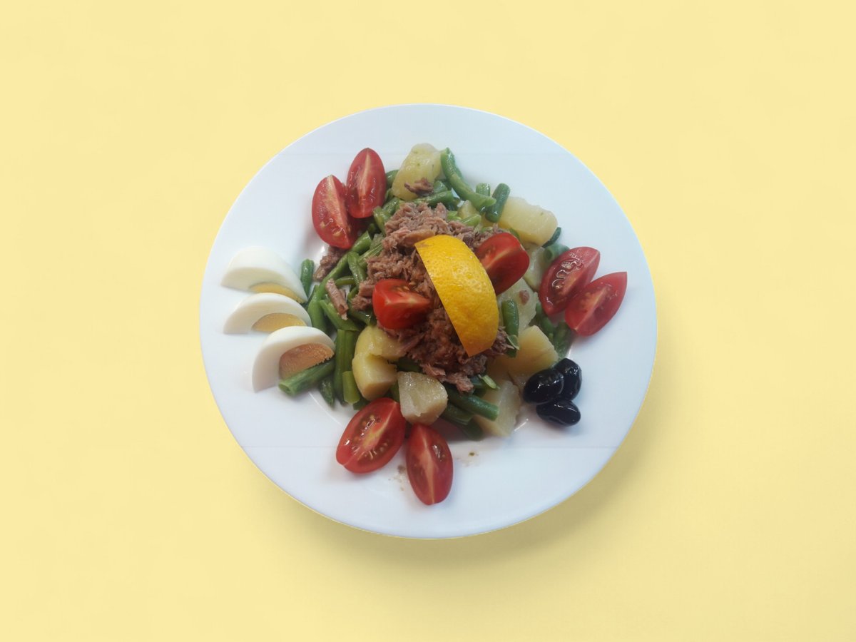 варен картоф зелен боб, риба тон, яйце, чери домати, маслини 350г