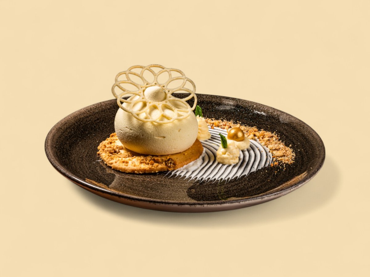 десерт с ванилов мус, център от солен карамел с печени бадеми, поднесен върху маслена платка и крем Шантили 120г