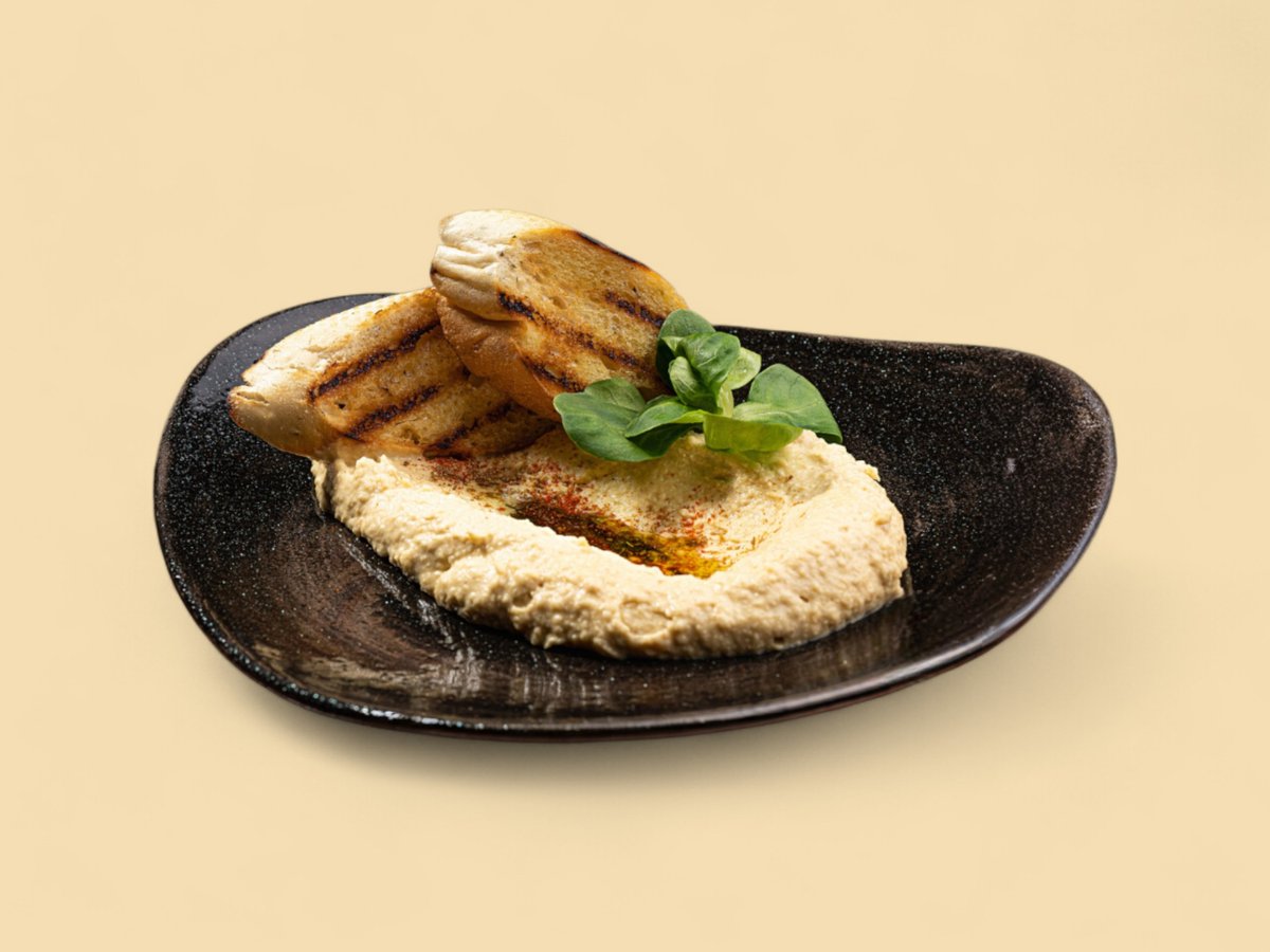 с брускети с маслинова паста и печен патладжан с чушка, кедрови ядки и дресинг от песто с нахут 400г