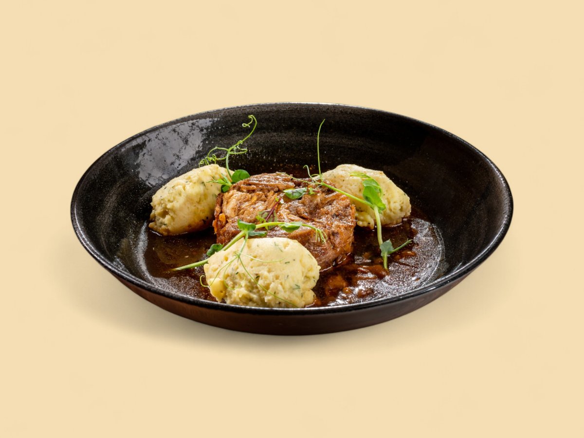 с пресни подправки, поднесени върху, качамак с фермерски кашкавал и печен сос с манатарки 400г