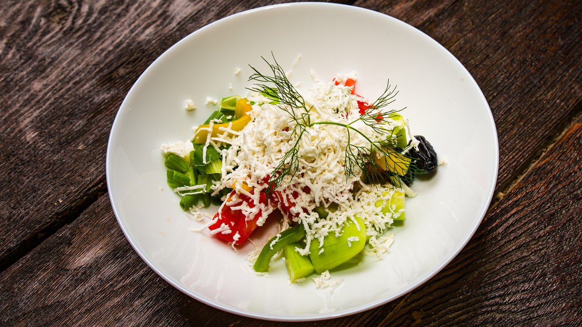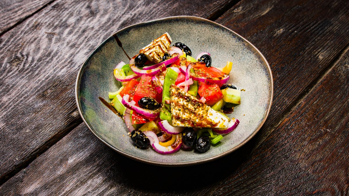 домат, краставица, червен лук, риган, гръцко сирене, маслини, зехтин 350г
