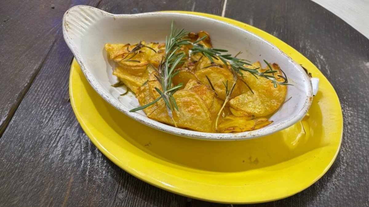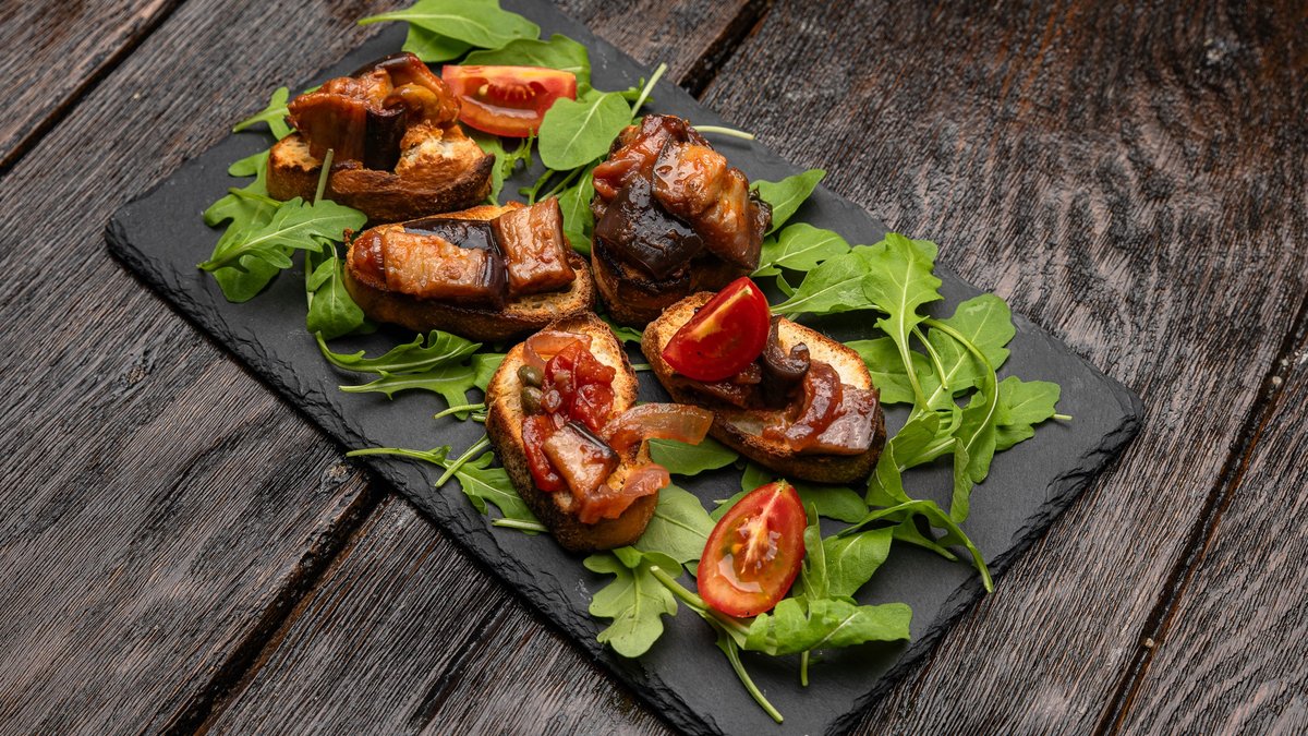 патладжан, зелени маслини, каперси, лук, домати върху 6 брускети 250 г