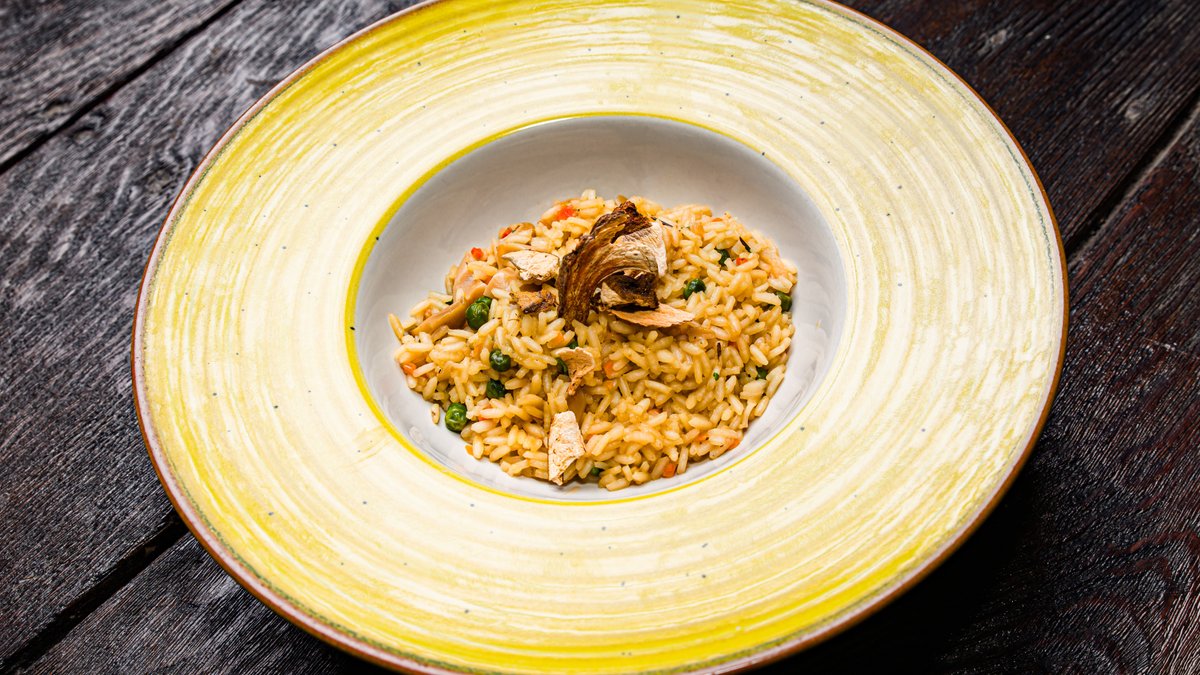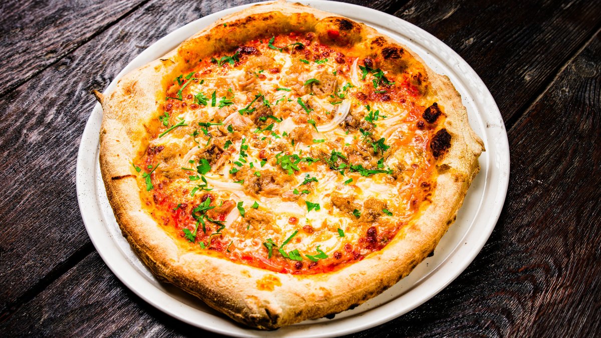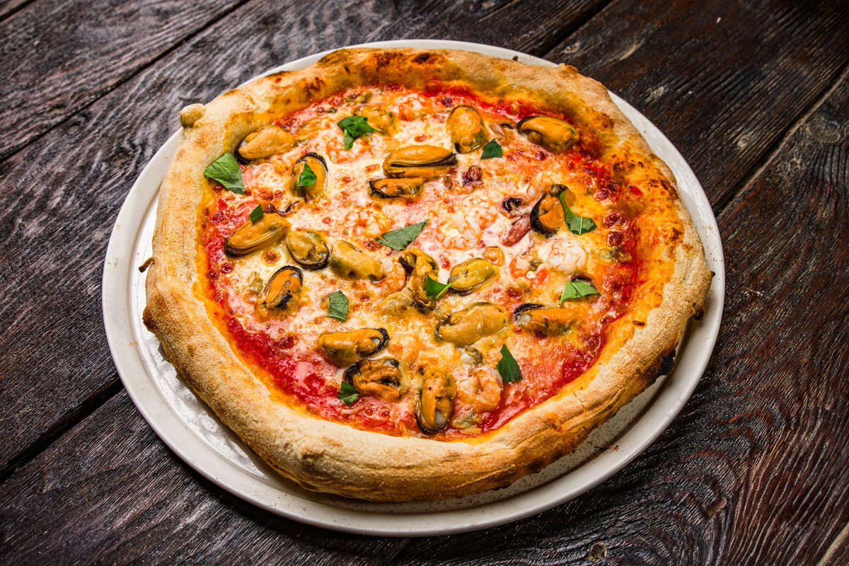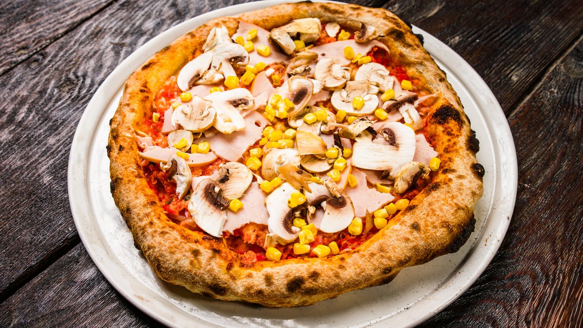 доматен сос, моцарела, пушено пилешко филе, гъби, царевица 33 см