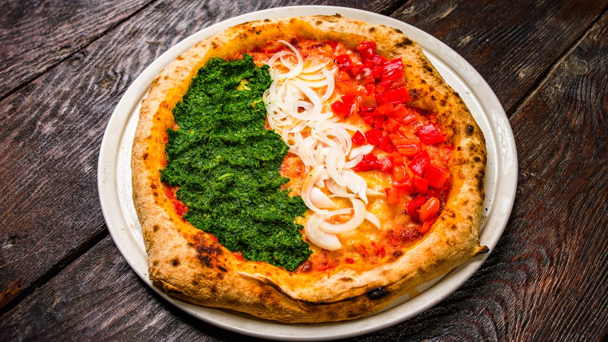 доматен сос, моцарела, спанак, лук, червена чушка, чесън 33 см