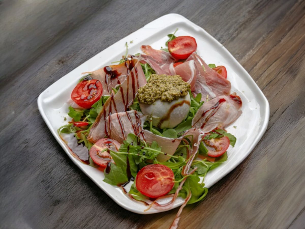 бурата, прошуто крудо, рукола, чери домати, 400г