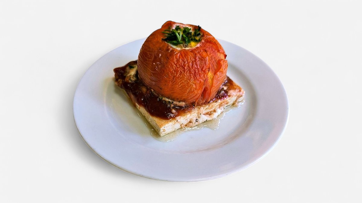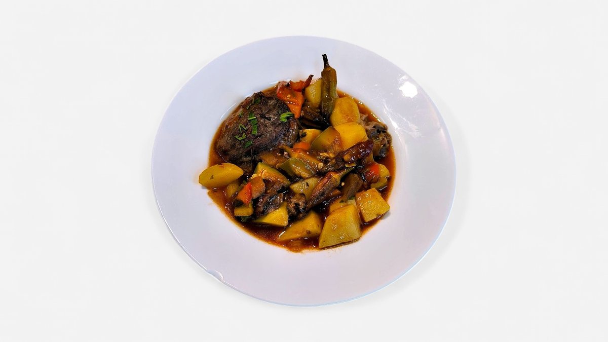 Телешки джолан с картофи, моркови, тиквичка, патладжан, бамя, доматен сос , 350гр.