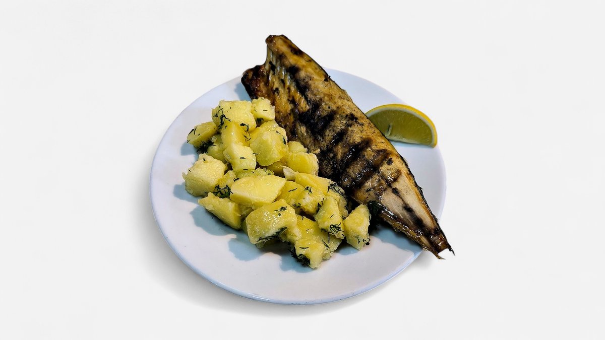 Половин риба скумрия, картофи на тиган с копър, 350гр.