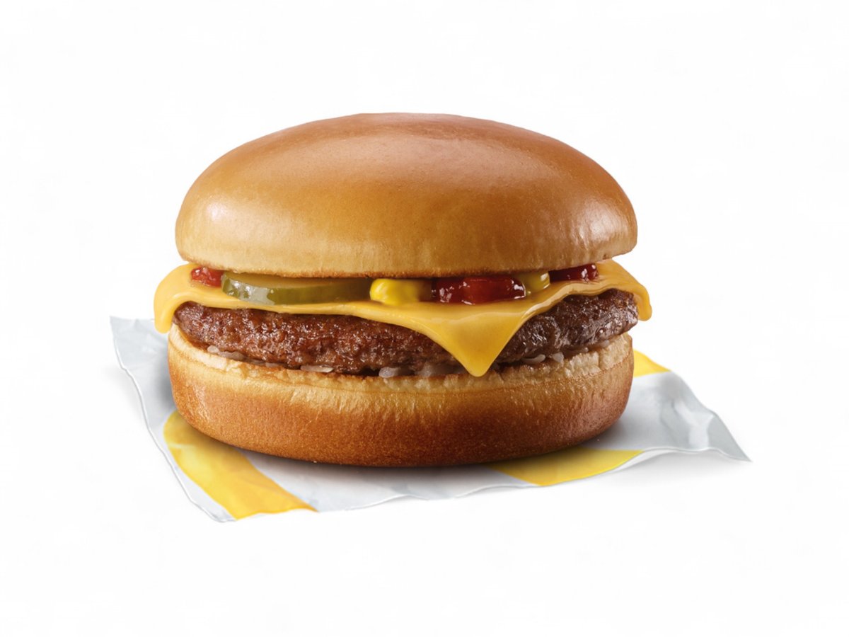 пухкава питка, две 100% телешки меса, две парчета сирене Чедър, кетчуп, горчица, кисели краставички и лук