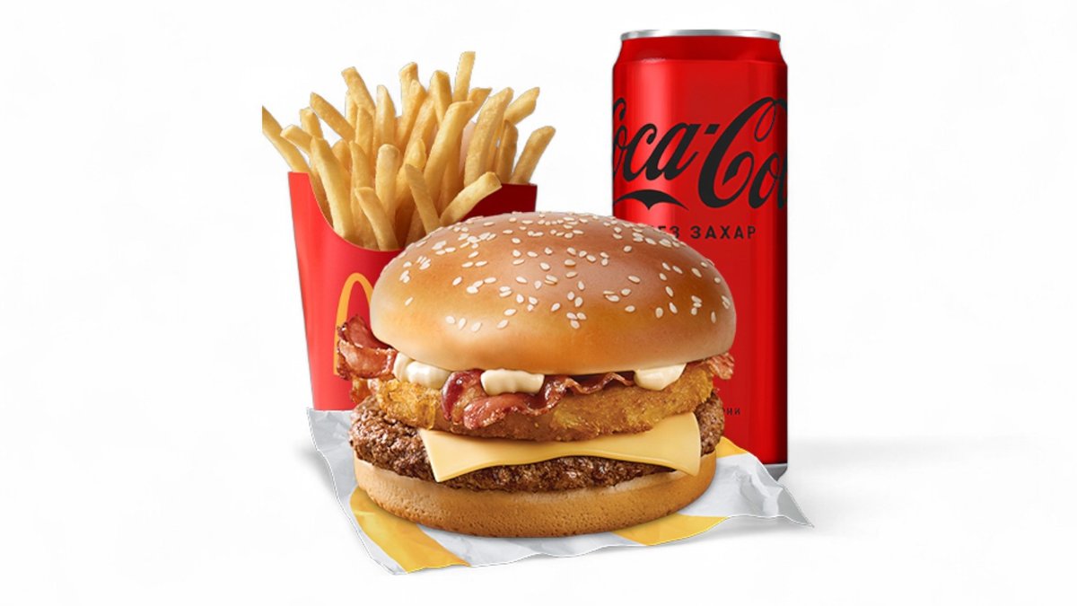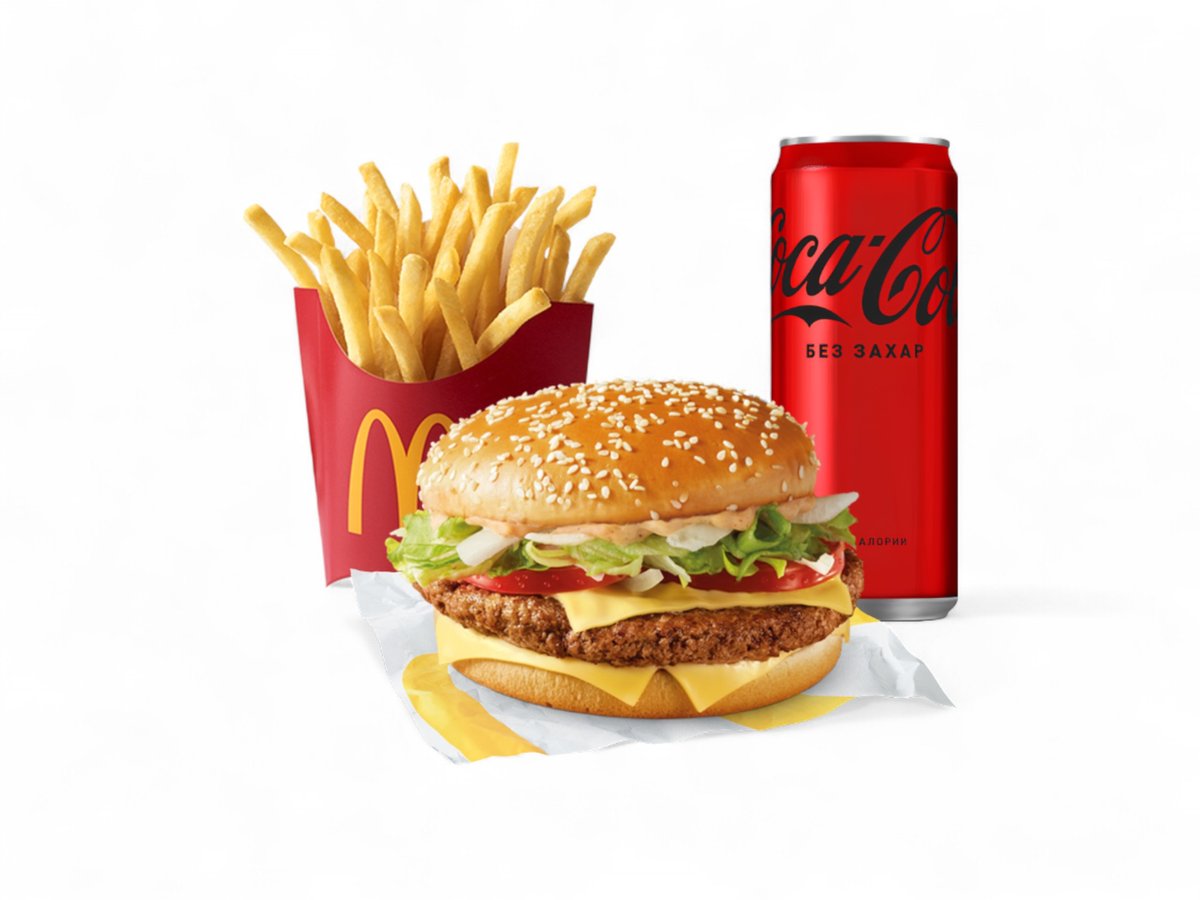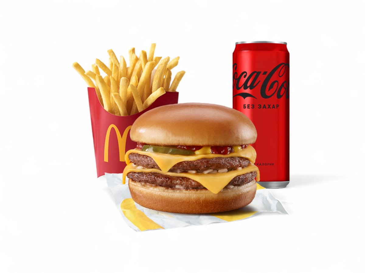 двоен чийзбургер със средни картофки или градинска салата и напитка по избор
