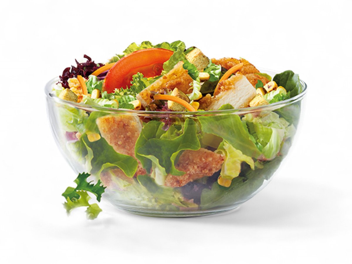 хрупкав микс от свежи салати, пресни домати, сладка царевица, ароматни крутони и панирано пилешко филе с включен сос по избор